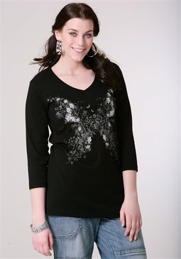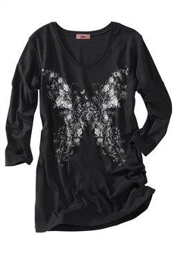 Женская кофта с рисунком в виде бабочки. С V-образным вырезом и рукавами длиной 3/4. Длина ок. 82 см. 100 % хлопок.