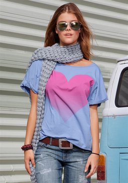 Стильная женская кофта. Широкие короткие рукава с отворотом. С рисунком в виде сердца. Асимметричный покрой. Длина сзади ок. 68 см, спереди – ок. 64 см. Состав: 100 % хлопок.