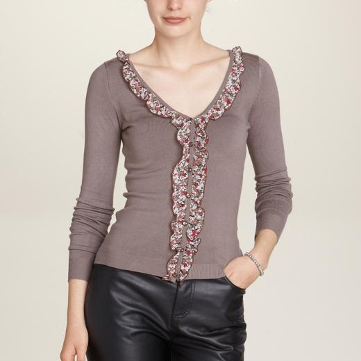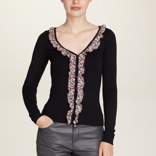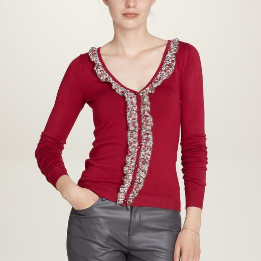 Модный женский кардиган. V-образный ворот. Застёжка на пуговицы украшена воланом из набивной вуали. Длинные рукава. Длина ок. 61 см. Трикотаж 73% вискоза 27% полиамид. Вуаль с цветочным набивным рисунком 100% полиэстер.