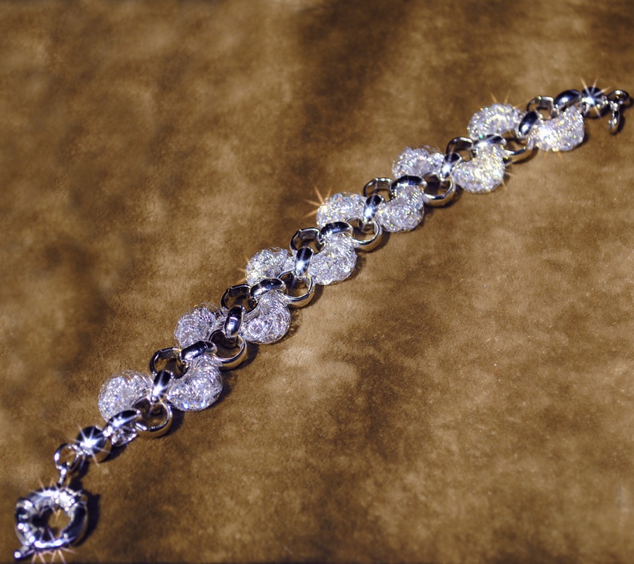 Шикарный браслет, выполненный крупными звеньями. Декорирован тонкой металлической сеточкой, заполненной стразами, что придает ему особое очарование и воздушность. Потрясающе сверкает и переливается при любом освещении. Добавьте шика в свой образ! Длина изделия ок. 21 см, ширина ок. 2 см.