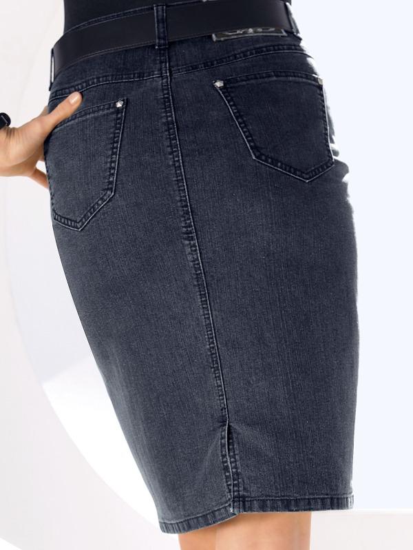 Джинсовая юбка покроя с 5 карманами, с поясом, выкроенным, слегка закругленным, и шлевками для ремня. Карманы сзади и шлевки для ремня с изящными заклепками. Передние карманы с заклепками различной формы. Шаговая шлица сзади. Прямой короткий покрой. Длина ок. 55 см. Из 80% хлопка, 17% полиэстера, 3% эластана.