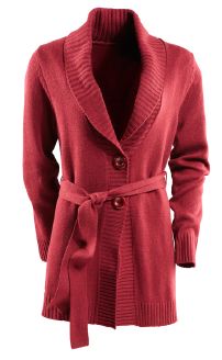 Модная кофта женская вязаная с поясом. Стильные детали: широкий воротник в рубчик, 2 пуговицы застежки, слегка приталенный покрой. Манжеты и кромка изделия в рубчик. Длина ок. 76-84 см. 100% полиакрил.