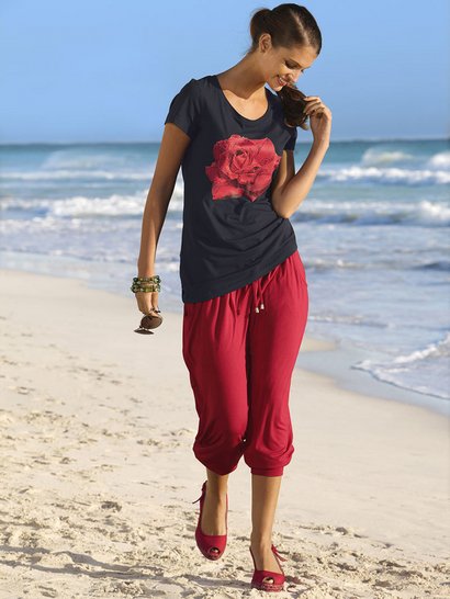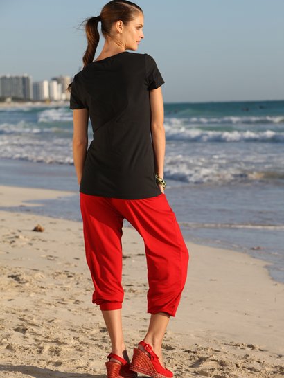 Шаровары – с женственно-небрежным шиком и в модном тренде! Мягкий пояс на резинке с протянутым шнуром, боковые карманы, свободный силуэт. Длина разм. 38 ок. 85 см. Материал: 95% вискоза, 5% эластан. Машинная стирка.