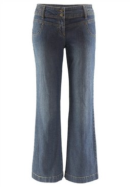 Джинсы-стрейч женские с экстрашироким поясом. Визуально делают фигуру стройнее. Спереди 2 пуговицы, особый покрой визуально моделирует область живота. Расклешенный покрой, на карманах заклепки. Удобный эластичный пояс. Длина брючин с внутренней стороны разм. N — ок. 82 см. 98% хлопок, 2% эластан.