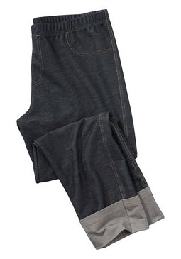 Леггинсы-капри женские. Тонкий эластичный материал. Модный покрой из ткани «под деним». С контрастной отстрочкой и отворотами внизу. Эластичный присборенный пояс. Длина брючин с внутренней стороны ок. 54 см. 60% хлопок, 35% полиэстер, 5% эластан.