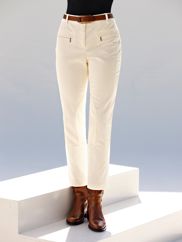 Вельветовые брюки «Римини», «Дудочки» с комфортной высотой сиденья. Пришитый пояс выкроен слегка закругленным. С карманами на молниях спереди и обозначенными карманами сзади. Актуальная, модно укороченная длина до щиколоток. Ширина низа ок. 36 см. Из 98% хлопка, 2% эластана. Длина с поясом N-размеров (с 36 по 52) ок. 96 см, К-размеров (с 18 по 26) ок. 90 см.