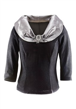 Кофта женская бархатная, в гламурном стиле. Из мягкого бархата, с модным широким воротником из блестящего атласа. Эксклюзивная декоративная брошка посередине воротника. 92 % полиэстер, 8 % эластан. Атласный ворот: 48 % полиэстер, 45 % полиамид, 7 % эластан.