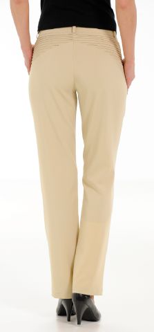 Брюки женские стрейчевые, с зауженными штанинами, фасонным поясом и швом спереди, оптимальный покрой. Кокетка украшена декоративными мелкими простроченными складками. На молнии. Длина по боковому шву: ок. 98,5-102 см. Длина по внутреннему шву: ок. 80 см. Ширина штанин снизу: ок. 37-46,5 см. Материал: 96% полиэстер, 4% эластан, твил. Машинная стирка.