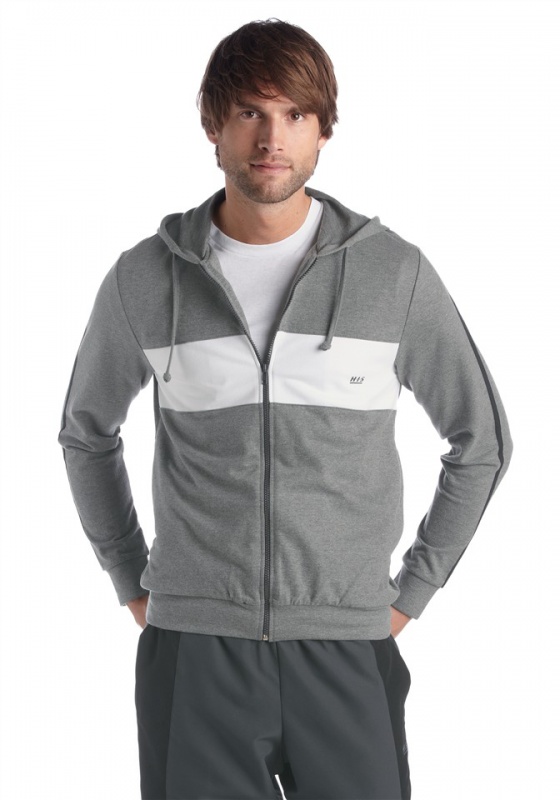 Мужская кофта в спортивном стиле. Капюшон со шнурком для регулировки. Застежка на молнию. С контрастной вставкой на груди. Длина для размера 52/54 около 72 см. Состав: 80% хлопок, 20% полиэстер.