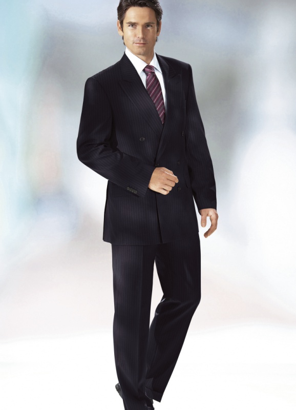 Элегантный тёмно-синий, полосатый мужской костюм. Пиджак с боковыми разрезами, четырьмя карманами и застёгивающийся на две пуговицы. Брюки с прорезными карманами и задними карманами на пуговицах. Состав: 60% шерсти, 38% полиэстера, 2% лайкры эластана. Подкладка: 100% полиэстер.