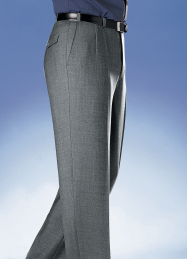 Привлекательные мужские брюки с частичной эластичным поясом, боковыми карманами, сшитые боковым швом и задними карманами на пуговицах. Состав: 54% полиэстера, 44% шерсти и 2% эластана.