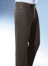 Удобные мужские брюки с эластичным поясом в нижней части живота, карманом для монет обшитым декоративной вышивкой, боковыми карманами и декоративными швами на задних карманах. Состав: 98% хлопка и 2% эластана.