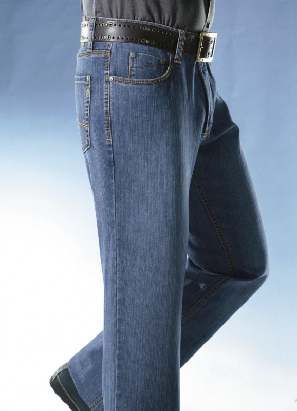 Мужские стрейчевые джинсы с эластичным поясом, декоративными заклепками на кармане для монет, с декоративной вышивкой на боковых карманах, декоративными швами и заклепками на задних карманах. Состав: 60% хлопка и 40% полиэстера.