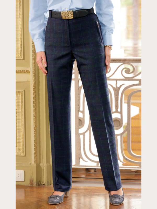 Классические женские брюки в клетку. Высокой посадки. Прямой покрой. Пояс с хлястиками с эластичными вставками. Впереди два врезных кармана на молнии. Застежка на пуговицу с молнией. Длина ок. 98 см. Ширина брючин ок. 42 см. 54% полиэстер, 44% стриженная шерсть, 2% эластан.