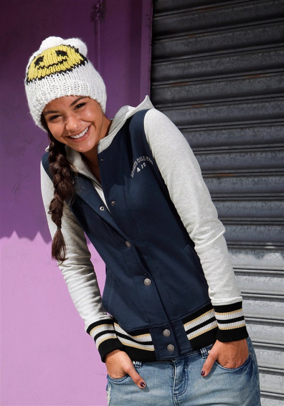 Женская бейсбольная трикотажная куртка с капюшоном. Актуальный стиль колледж. Застёжка на молнию и капюшон контрастного цвета создают эффект многослойности. Планка застёжки на кнопки. Контрастная окантовка в рубчик и вышивка спереди. Длина ок.: 64 см. 50% хлопка, 50% полиэстера.