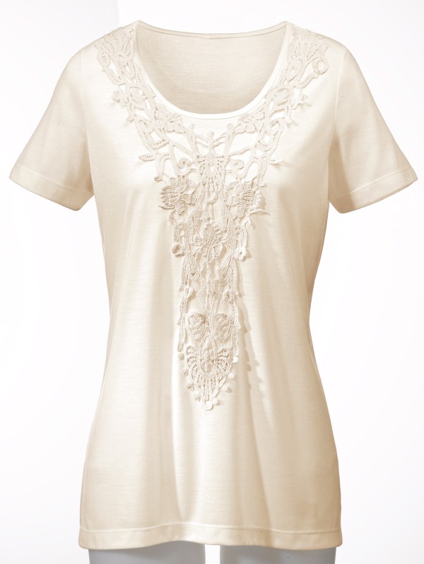Элегантная кофта с круглым вырезом горловины, с кружевной отделкой спереди. Красиво обыгрывающего фигуру покроя, с короткими рукавами, с разм. 44 прямого покроя. Длина разм. 42 ок. 72 см. Материал. 65% полиэстера/35% вискозы. Машинная стирка.