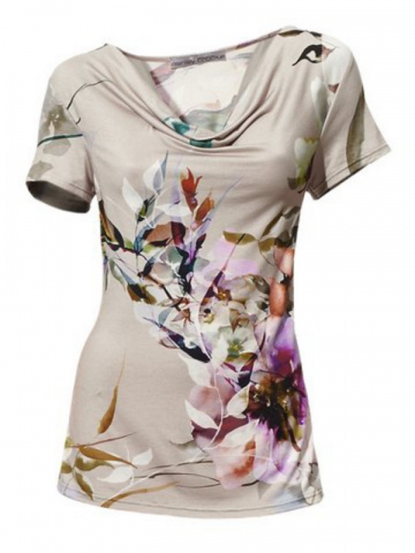 Элегантная женская кофта с потрясающим цветочным принтом. Стильный каскадный воротник, с короткими рукавами. Длина ок. 60 см. Подчеркивающий фигуру покрой. Состав: 90% вискозы, 10% эластана. Машинная стирка.