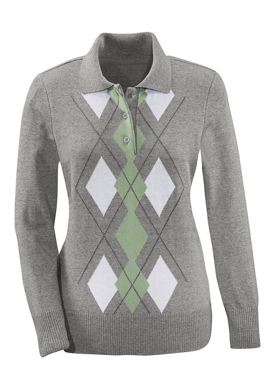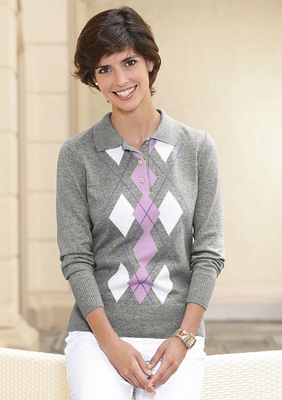 Элегантный женский пуловер из невероятно мягкой и комфортной меланжевой пряжи. Воротник-поло на пуговицах. Спереди актуальный рисунок в виде ромбов. Длина для размера 42 около 66 см. Состав: 50% хлопок, 50% полиакрил. Машинная стирка.